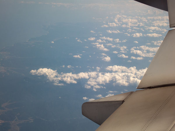 Heading over the top this afternoon—headwinds as high as 129mph. 500 miles from Detroit, heading north at 32,00 feet. With 6000 miles left on this leg of the flight, I am thinking about how unfamiliar things look already. Gone are cell phone service, text messaging, English as the primary language. At this altitude it is -46°F. The in-flight map shows that we will be skirting the edge of Hudson Bay before bending west, north of Alaska, then arcing down across Siberia to Korea. Unfortunately most of what I am looking at are clouds and a very big wing. From the look of the land below, this route leaves behind the signs of civilization that are apparent over the rest of North America.Eventually I will also be leaving behind quite a bit more. Credit cards and coffee, most of the diet I am used to. Driving to get where I want to go.