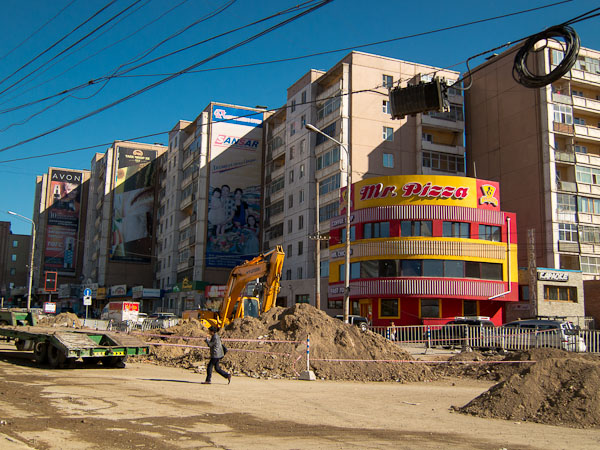 Ulaanbaatar is a city that is growing everywhere, all at once, at a frantic pace. Cranes spike the skyline in all directions, from center city out to the very edges of town. Practically all of this activity seems to be private business ventures such as corporate offices and luxury housing. What is noticeable is that for all the private activity there is relatively little public infrastructure activity going on. This morning we walked through several blocks of major renovation to Uh Toyruu, a major artery that loops across the north side of the city. It is being completely rebuilt with an excavation that goes deep under the road's surface. We also got to the center of the city near the Government House, where the roads and sidewalks have been recently replaced. And a new highway to the airport is being built to replace the present decaying one. Still, there is a lot of catching up to be done.