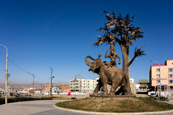 Bird, Rabbit, Monkey, Elephant and Tree. Sculpture on an island at the bend where B. Dorj Street meets Ih Toyruu