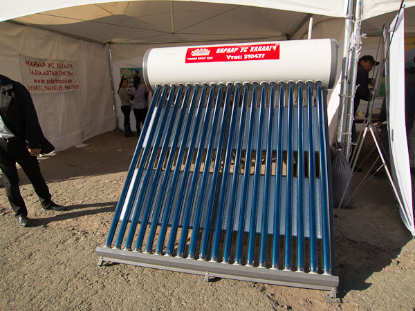 I am noticing architecture and construction today, and the many interesting differences. Many still live in gers, or some combination of small wooden structure in the summer and ger in winter, since the ger is easier to heat. A trade fair for high-tech housing in the Government House plaza showed off high efficiency stoves, solar water heaters, waste incinerators, steel channel ger frames, and model gers complete with flush toilets and cable tv.
