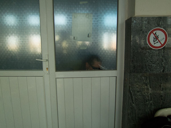 Peaking through peeling corner to the baggage area at Khovd Airport.