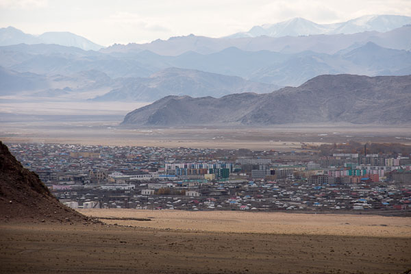 We hiked northeast out of town through what looks like the town dump, climbing gradually until we reached a cemetery. Then up the end of the bowl to a pass where we had lunch and a view north to an area where fields are laid out beside the Buyant River. (There are still cabbages standing. I have been wondering where the food at the market comes from, since it is so dry here.) Then, after lunch, up. We wove our way up the steep side of the ridge to come to a spot where we could see, at the same time, the city behind us and the northern edge of Har Us Lake in front of us in the distance. Between us and the lake were miles of rock and sand. In the flat bottom the river braided its way north and would eventually meet up with the Khovd River before emptying into the lake.