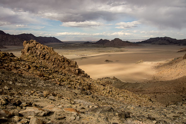 We hiked northeast out of town through what looks like the town dump, climbing gradually until we reached a cemetery. Then up the end of the bowl to a pass where we had lunch and a view north to an area where fields are laid out beside the Buyant River. (There are still cabbages standing. I have been wondering where the food at the market comes from, since it is so dry here.) Then, after lunch, up. We wove our way up the steep side of the ridge to come to a spot where we could see, at the same time, the city behind us and the northern edge of Har Us Lake in front of us in the distance. Between us and the lake were miles of rock and sand. In the flat bottom the river braided its way north and would eventually meet up with the Khovd River before emptying into the lake.
