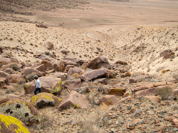We hiked northeast out of town through what looks like the town dump, climbing gradually until we reached a cemetery. Then up the end of the bowl to a pass where we had lunch and a view north to an area where fields are laid out beside the Buyant River. (There are still cabbages standing. I have been wondering where the food at the market comes from, since it is so dry here.) Then, after lunch, up. We wove our way up the steep side of the ridge to come to a spot where we could see, at the same time, the city behind us and the northern edge of Har Us Lake in front of us in the distance. Between us and the lake were miles of rock and sand. In the flat bottom the river braided its way north and would eventually meet up with the Khovd River before emptying into the lake.