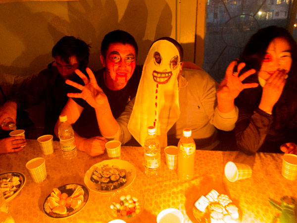 You may be surprised that we celebrated Halloween here yesterday. I certainly was when I got my invitation to the Chinese/English department's annual party. Halloween is not a holiday that is usually recognized in Mongolia, a fact that I was very conscious of as I walked across the main square in broad daylight dressed as a cow. But in the Chinese/English department, it is a way to explain a little bit of American culture to students of English. (Really, how else would you explain it?) Aside from doing a good job of dressing up like Americans, it was an opportunity to perform, as each class put on a dance or sang. In between there were competitions. Stack the nuts with a chopstick, random couples assigned an animal to imitate in the process of mate selection, and my favorite, stick the card in the watermelon. A watermelon is cut in half, each half is set on a table so that the red side faces the contestants, who flip playing cards at it in an attempt to stick them into the flesh. The team that gets all its players to stick a card first wins.