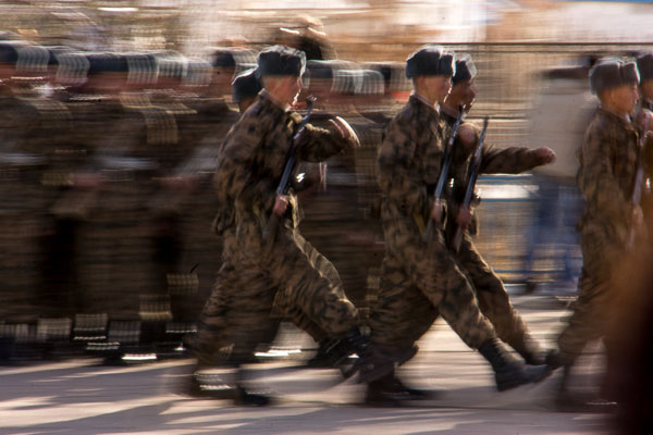 Today is Chingas Khan's 850th birthday, a national holiday here in Mongolia. Schools and businesses are closed, and we have had the day off. I used the morning to catch up on some grading and had planned to work on another notebook in the afternoon. But on my way to the square to get my daily photos I was met by a large celebration. It took a while before I ran into some people I know who could explain that on this day every year new recruits are inducted into the army. Although it is a peaceful country now, celebrating the renewal of the present Mongolian army on the great conqueror's birthday provides a reminder that this was not always the case.