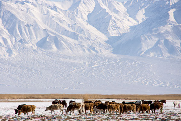 Farther down the road, my students saw a ger that looked inhabited, so our driver simply left the road and headed across snow and the sparse vegetation to give us a look at the process of herding goats and evaluating them for the market. While my students automatically pitched in to help with the herding, I photographed. And photographed. And eventually, was lead to understand that my students did not bring me here just for my pleasure, but that they wanted to talk. And through this negotiation, which started at the goat herd and found resolution as we struggled to understand each other in a van that barreled across the desert, we stopped the van and agreed to meet the driver down the road a way as we walked along the frozen lake shore. For several reasons, it was a good decision.
