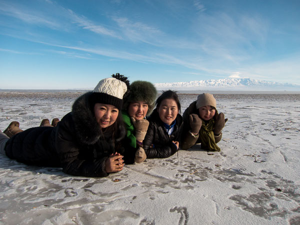 Farther down the road, my students saw a ger that looked inhabited, so our driver simply left the road and headed across snow and the sparse vegetation to give us a look at the process of herding goats and evaluating them for the market. While my students automatically pitched in to help with the herding, I photographed. And photographed. And eventually, was lead to understand that my students did not bring me here just for my pleasure, but that they wanted to talk. And through this negotiation, which started at the goat herd and found resolution as we struggled to understand each other in a van that barreled across the desert, we stopped the van and agreed to meet the driver down the road a way as we walked along the frozen lake shore. For several reasons, it was a good decision.