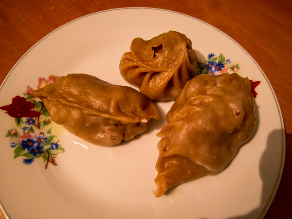 aarts, (a hot drink that is sour and has flour in it,) and seasoning for the buutz. It's not clear what our next attempt at making buutz will be like, but even in our sparsely equipped kitchen theirs were nearly perfect, executed in two different styles. One was the Mongolian style, which ends up like a pinwheel. The other was in the Khazak style, folded like a calzone and pinched in a very stylized way. Although mine were pathetic in comparison, they all tasted like they would keep a person warm in a Mongolian blizzard. The kilogram of mutton contains plenty of fat, and it is wrapped in dough made with another kilo of flour. The finished dumplings are then steamed. Although the four of us put a pretty good dent in the batch we made, there are still leftovers in the refrigerator, even after an early lunch today.