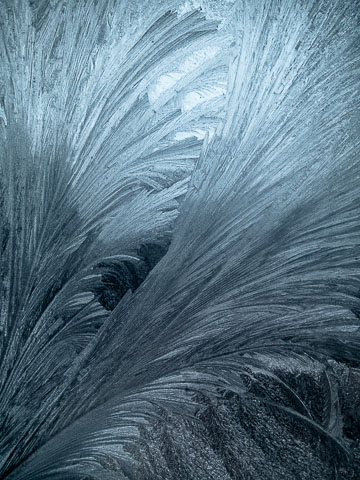 Until then, I have been enjoying the frost that these frigid conditions re-arranges for me every day. These are all images made at a few windows at school, where I take a few minutes between classes to record them. The windows face a central courtyard, which is often visible in the background. The colors change with the time of day and the weather conditions. Also visible are the tape that is used to patch together broken panes and paint splashes on the outside of the glass. Most of these are full-frame images, but for some I can't resist showing you an enlarged detail.