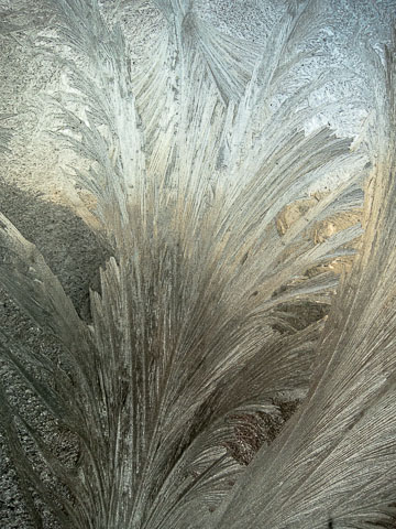 Until then, I have been enjoying the frost that these frigid conditions re-arranges for me every day. These are all images made at a few windows at school, where I take a few minutes between classes to record them. The windows face a central courtyard, which is often visible in the background. The colors change with the time of day and the weather conditions. Also visible are the tape that is used to patch together broken panes and paint splashes on the outside of the glass. Most of these are full-frame images, but for some I can't resist showing you an enlarged detail.