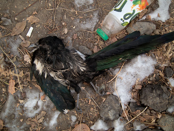 Outside of town, the reminders are more subtle. Life and death continue at their own pace. A hawk dusts a pigeon. Another hawk dies an unexplained death. It is both cold and dry, so both remains remain for a very long time. I find a pack of dogs that are feasting on a horse. It's not at all clear how the horse died, but very clear what is happening to it now.