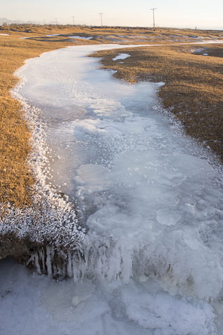 The Buyant River is spilling out of its banks now. The water is freezing into chunks that collect, dam up, and divert the flow over ground that is nearly flat. Although I am within walking distance of the same latitude as Emerson Orchard on Flathead Lake, the weather here comes from Siberia and not the Pacific Ocean, and we are at twice the altitude. During the long nights the temperature has been dropping to -10, -20, and a few nights ago, nearly -30°F. The feeble sun has been bringing the thermometer back above 0°F in the daytime, but not by more than a digit. The water that flows over this ground does not stay liquid for long. Low ground fills with ice, frozen from the surface all the way to the grass or gravel below. Shallow washes created by floods become main arteries as the primary flow is re-routed. They, in turn, ice over, solidify, and divert the water to the next lowest ground. One month ago I could run along the main bank of the river, but now I cannot even find it. On my way out of town to the west, the branch of the river spanned by the bridge is completely dry, reappearing mysteriously a half mile further downstream.