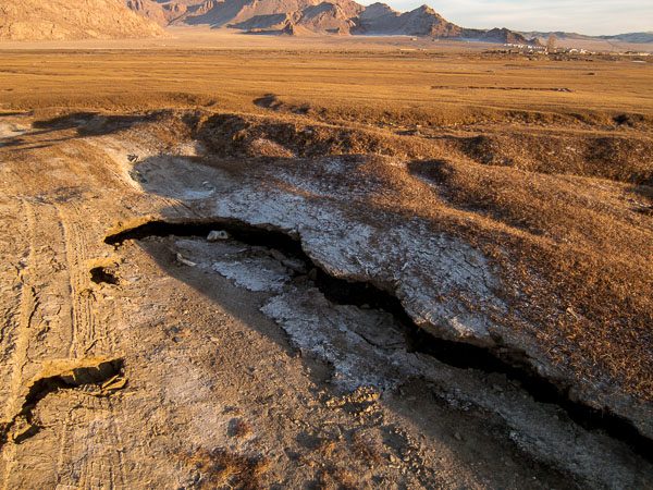 In addition to the movement in the river, there are large cracks forming in the soil, including the one on this road.