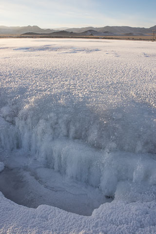 The Buyant River is spilling out of its banks now. The water is freezing into chunks that collect, dam up, and divert the flow over ground that is nearly flat. Although I am within walking distance of the same latitude as Emerson Orchard on Flathead Lake, the weather here comes from Siberia and not the Pacific Ocean, and we are at twice the altitude. During the long nights the temperature has been dropping to -10, -20, and a few nights ago, nearly -30°F. The feeble sun has been bringing the thermometer back above 0°F in the daytime, but not by more than a digit. The water that flows over this ground does not stay liquid for long. Low ground fills with ice, frozen from the surface all the way to the grass or gravel below. Shallow washes created by floods become main arteries as the primary flow is re-routed. They, in turn, ice over, solidify, and divert the water to the next lowest ground. One month ago I could run along the main bank of the river, but now I cannot even find it. On my way out of town to the west, the branch of the river spanned by the bridge is completely dry, reappearing mysteriously a half mile further downstream.