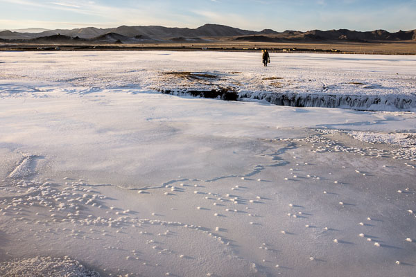 The Buyant River is spilling out of its banks now. The water is freezing into chunks that collect, dam up, and divert the flow over ground that is nearly flat. Although I am within walking distance of the same latitude as Emerson Orchard on Flathead Lake, the weather here comes from Siberia and not the Pacific Ocean, and we are at twice the altitude. During the long nights the temperature has been dropping to -10, -20, and a few nights ago, nearly -30°F. The feeble sun has been bringing the thermometer back above 0°F in the daytime, but not by more than a digit. The water that flows over this ground does not stay liquid for long. Low ground fills with ice, frozen from the surface all the way to the grass or gravel below. Shallow washes created by floods become main arteries as the primary flow is re-routed. They, in turn, ice over, solidify, and divert the water to the next lowest ground. One month ago I could run along the main bank of the river, but now I cannot even find it. On my way out of town to the west, the branch of the river spanned by the bridge is completely dry, reappearing mysteriously a half mile further downstream.