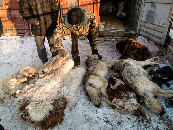 It also seems that good luck is for sale. Having your picture taken with a wolf on New Years Eve is said, at least by one photographer, to be good luck. Ankle bones are sold in gift shops, but the whole wolf can be purchased at the market. And although I have only heard one person support this hunch—"Maybe someone is trying to cheat another person,"—there may even be trade in counterfeit good luck, for that's the only explanation I can imagine for the corpse of a large dog that is missing all four feet. (The difference between a wolf's ankle bone and a dog's may not be detectable to those who are badly in need of good luck. In this case, good luck would be turning four dog ankle bones into 100,000₮.) In addition to the ankle bone, a wolf's meat is thought to be healthy, and the skin is very warm.