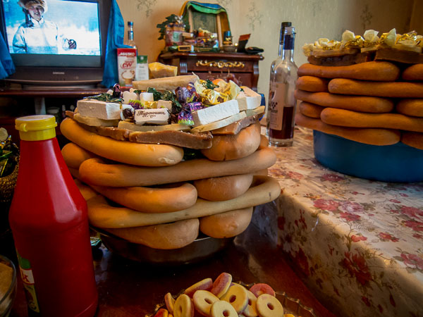 The University is closed for the first two days, and students who live in the countryside didn't return to school until after they had celebrated with their families, missing the first week of class. The big market is closed for the first five days, and is barely in business for the next several days after that, so shopping is limited. Presents are given to all visitors, and brought to the household being visited. Along with the duty to serve all visitors is the duty to visit, and the duty to eat large helpings of food that has been prepared for each visit—either buuz or its smaller relative, the bansh. There is always some form of bol, large stacks of dried curd, or specially baked or fried bread (in exactly five or seven layers) and further heaped with white cubes of curd, sugar cubes, or other candy that is preferably white.