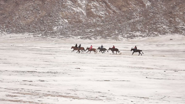 On this first race of the season, spring was just around the corner as light snow lingered on the ground. The race course is a ten kilometer one-way route that is all uphill, across the sand and rock desert that spans most of the western view from downtown Khovd. Registration is somewhere downhill of the halfway point in the race, so when they are ready, riders and horses make their way the three or so miles to the starting line. If there is a minimum size or age for the riders I could not tell what it was. The strategy seems to be the smaller and lighter, the better.