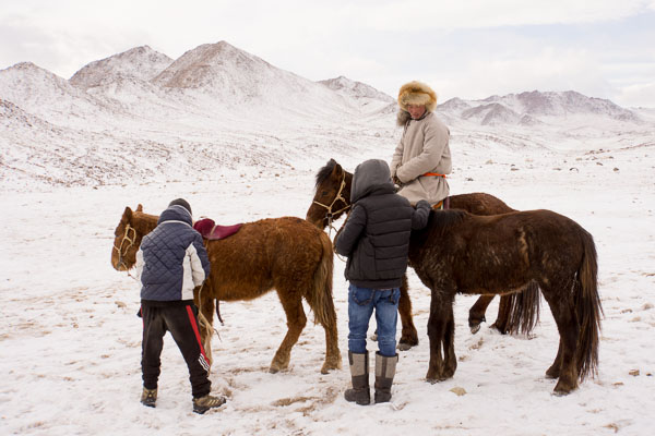 On this first race of the season, spring was just around the corner as light snow lingered on the ground. The race course is a ten kilometer one-way route that is all uphill, across the sand and rock desert that spans most of the western view from downtown Khovd. Registration is somewhere downhill of the halfway point in the race, so when they are ready, riders and horses make their way the three or so miles to the starting line. If there is a minimum size or age for the riders I could not tell what it was. The strategy seems to be the smaller and lighter, the better.