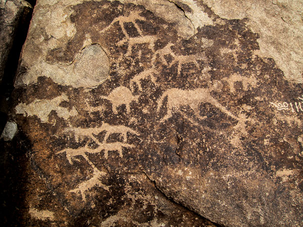 To confuse the issue of dating these drawings, it seems that some older drawings have been enhanced by modern helpers. Natural processes of erosion and the cracking of rock are also taking a toll. Well out onto the flat plain that meets the steep sides of the mountain, pieces of rock can be found with drawings or parts of drawings on them. More disturbing are areas where it looks as though pieces of the rock have been removed by unnatural means, either taken for their drawings or quarried for use as building material.