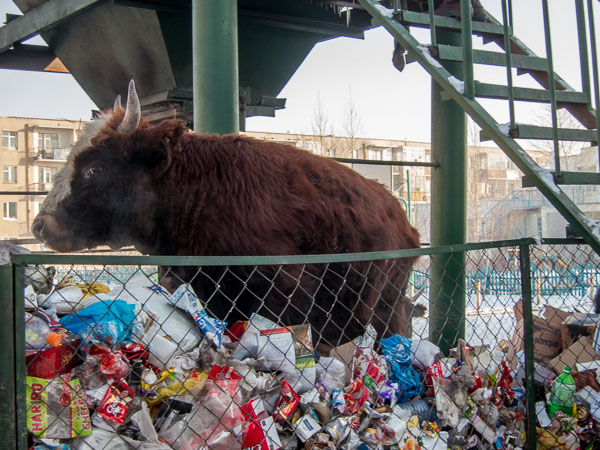 They are, however, very resourceful. A look at the landscape here at this time of year will tell you that grazing on grass is a tough way to make a living. From a cow's point of view, there are more attractive options, most of these being some form of creative scavenging, or more bluntly, nosing around through garbage for the leftovers that people throw away. A hungry cow is a force that is not to be taken lightly. We have watched the continuing saga outside our apartment's entrance as one piece of technology after another has bent, literally, to the cows who invade the garbage pile. To keep them from spreading the garbage around, we have watched the construction of a garbage tipple (vastly undersized for the job,) and now a fence, whose gate is dismantled by the brute force of hungry cows only hours after each repair.