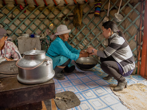 The first trip was organized by the university for foreign teachers and students, so our group included Inner Mongolians, Koreans, Russians, and these two Americans. We started by stopping at Har Us Noor, went to visit a herder family (the mother of the bus's driver) and then on to Manhan, where we had lunch with the local school administrators, visited a temple and a museum, and then headed on to the site of ancient cave paintings. Along the way we stopped at another petroglyph site, the site where prehistoric human remains were found, and the tumbled rock ruins of another settlement.