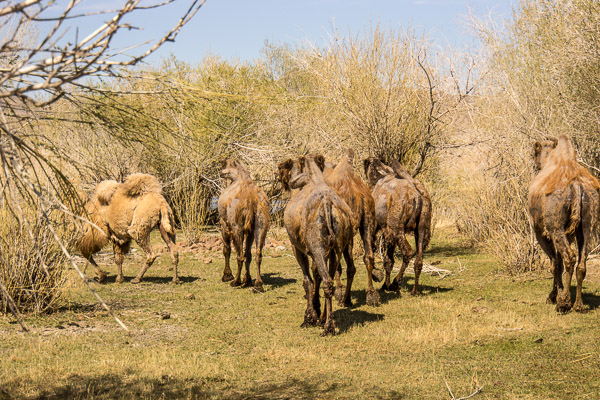 After dismounting and tying his horse, the camels change their mind about giving us a ride.