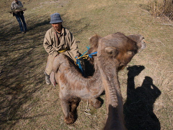 The other trip was made with our neighbor Ojoo, who needed to check on his horses at the place up the Khovd River where they are being cared for by a local family. He asked if we would like to go along for the ride, and also wondered if we would like to try fishing. He didn't need to ask twice. We took along Puje, a graduating senior at our university, to translate for us when needed. He was able to get me onto a horse, and I tried to introduce him to fly fishing. To get to where the best fishing was rumored to be, we forded the river on horseback. The water was deeper than expected, the saddle on Judy's horse came off as the horse climbed the far bank, but the weather was nice so we all dried out quickly. In an attempt to do better for our return crossing our host brought in some camels, who were not easily convinced that carrying people were what they wanted to do that afternoon. Eventually two were cornered, harnessed, and boarded for the crossing.