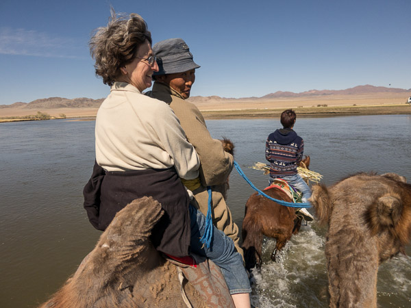 The other trip was made with our neighbor Ojoo, who needed to check on his horses at the place up the Khovd River where they are being cared for by a local family. He asked if we would like to go along for the ride, and also wondered if we would like to try fishing. He didn't need to ask twice. We took along Puje, a graduating senior at our university, to translate for us when needed. He was able to get me onto a horse, and I tried to introduce him to fly fishing. To get to where the best fishing was rumored to be, we forded the river on horseback. The water was deeper than expected, the saddle on Judy's horse came off as the horse climbed the far bank, but the weather was nice so we all dried out quickly. In an attempt to do better for our return crossing our host brought in some camels, who were not easily convinced that carrying people were what they wanted to do that afternoon. Eventually two were cornered, harnessed, and boarded for the crossing.