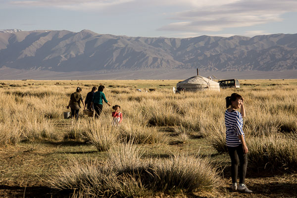 Another field trip last weekend, this time to Зэрэг баг, (Zereg Bog) a sparse collection of gers spread out along the flat area beneath the southern edge of Jargalant Mountain. We went with Davaa, the woman who works at the herder shop near our apartment where Judy bought her deel. Davaa's family has livestock there. One branch of the family has 2500 head of various members of the Mongoian five snouts: cows, horses, goats, sheep, and camels. Davaa's branch of the family has fewer animals, but among them are sixty camels that we could see, which they kept close to their ger. Thirty were adult females, and another thirty were their young offspring. Males are kept somewhere near the higher elevations of Jargalant.