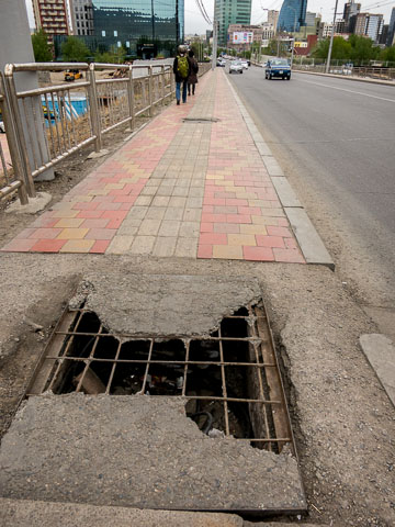 there?" asked Steve. "Was that burned on purpose or by accident?" "Have these buildings ever been painted?" All reasonable questions, to which I could only shrug my shoulders. We peered into deep holes in the street or sidewalk where, in our own country, a manhole cover would keep inattentive drivers or pedestrians from injury.