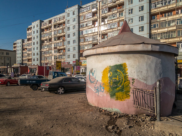 Ger-shaped stucco coffee shack across the street from Soviet-era apartments.