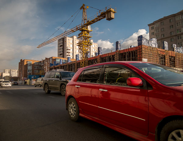 From above, Ulaanbaatar sprawls east and west, up and down the Tuul River valley between dry grass-covered hills to the north and south. It presents itself as a nearly solid expanse of buildings, broken only occasionally by an open space—a park, vacant lots, or a pending construction site. At street level, you get an entirely different impression. Even without your sense of sight, the sound of construction is everywhere. Jackhammers, drills, grinders, saws, and earthmoving equipment fill the air with their combined roar. A walk around any block with your eyes open will confirm what your ears are telling you. Construction is everywhere, with cranes that loom over the hundreds of partially completed buildings.