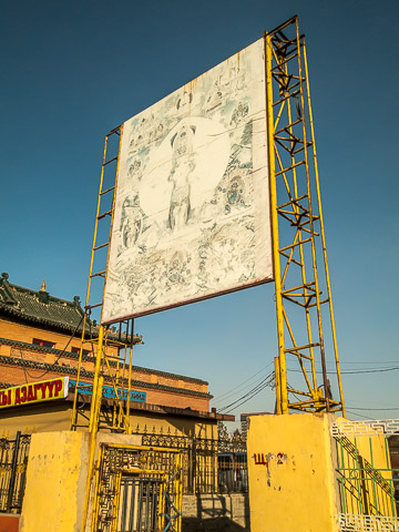 Not all of my puzzling comes from language though. At the intersection of Peace and Olympic, one of the busiest corners in Ulaanbaatar, there is a billboard with the Czech Republic Development Corporation's name in one corner. A smiling Mongolian couple sits on what must certainly be a roll of wool, the man holding a white hard hat, the woman leaning in from behind in a short sleeved shirt. They and their bundle of wool have been stripped into an unimaginably green lawn, which surrounds a log house with a glazed tile roof. The Mongolian words, as best as I can translate them, refer to sheep's fleece and wool, and its beneficial qualities as thermal insulation and as a sound-proofing material. I did not translate the smallest type, but the take-away concept behind this sign remains uncertain. Are the Czechs hoping to sell wool to Mongolians? Perhaps they want to buy wool and use it to insulate log homes that are then exported to Mongolia. Either way, is a sign at this intersection, where drivers are intent on getting as close to scurrying pedestrians as possible, the best place to try to get that message across?