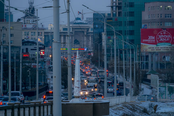 Evening rush hour traffic moving toward Sukhbaatar Square from Peace Bridge.