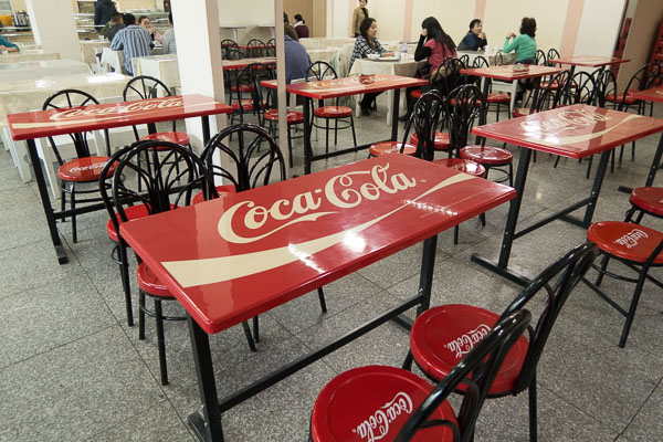 Grocery Store, like the one shown here) on the sign across its facade. At cafeterias on both of the college campuses where Judy teaches, the chairs and tables are ablaze with Coke-red and the familiar white script.