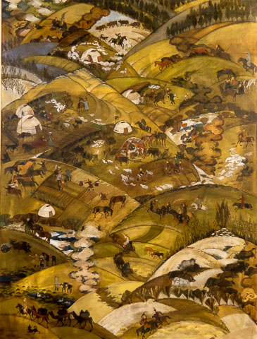 Nurmaajav has taken on the task of incorporating traditional Mongolian painting into a contemporary form. She told me that Mongolian painting is foremost about narrative, a story that is customarily told about the land and its people. So important is that narrative that in traditional painting, factual visual details are often changed to keep from obscuring the narrative—the roof of a ger is cut away to reveal the activity inside, or most commonly, an aerial view is taken to overcome the limitations of the view from the ground. As if to prove that she understands conventional expectation and the measure of skill she would be judged against as a Mongolian artist,