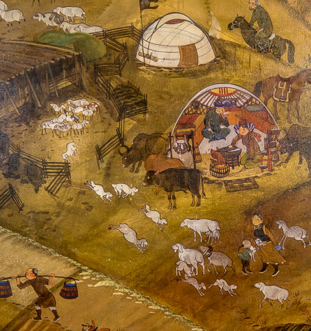 Nurmaajav has taken on the task of incorporating traditional Mongolian painting into a contemporary form. She told me that Mongolian painting is foremost about narrative, a story that is customarily told about the land and its people. So important is that narrative that in traditional painting, factual visual details are often changed to keep from obscuring the narrative—the roof of a ger is cut away to reveal the activity inside, or most commonly, an aerial view is taken to overcome the limitations of the view from the ground. As if to prove that she understands conventional expectation and the measure of skill she would be judged against as a Mongolian artist,