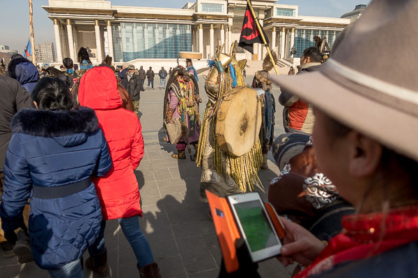 Twenty minutes went by, and then, unannounced, a group of about twenty other shamans arrived. The crowd was reconfigured, and the speeches began in ernest, one shaman at a time stepping up to a woman holding a wireless microphone to have his or her say. Some spoke unassisted, but others were passed a mobile phone by the woman with the microphone, from which they could read, also while holding it in their hand and hiding it behind their drum. As always, some seemed better at eliciting response from the crowd, which chanted "Uulaa, Uulaa!" from time to time, a variation of a word that means mountain, but also drinking. Traditionally dressed organizers kept the crowd at bay, arranging people in perfect order so that nobody would have their view of the shamans obstructed by the crowd. It was a protest that was created for the widest possible distribution, and there was no room for those who were carried away by the pull of the moment.