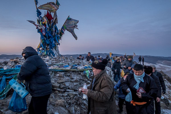 As an offering to the mountain, or perhaps for insurance or extra luck, those making the climb brought food, incense, vodka, and most often milk, to make as an offering at the ovoo, the shrine on top built from the collective contributions of visitors, each of whom are obliged to circle three times, tossing a rock on the pile with each loop. Around the perimeter small displays of bread and dried curd have been set up by some, while trying to keep candles lit in the wind. Others climbed the ovoo to tie new khadags, pieces of colored cloth, to the wooden posts at its center. Closer to sunrise, activity moved away from the ovoo to the east-facing slope of the mountain, the large crowd now gathering in small groups, each individual shifting to get a better view. As the sun broke the horizon the last of the milk was thrown to the wind, covering everyone with white spots. Hands and arms raised, the crowd chanted—roared, actually. And then it was done.