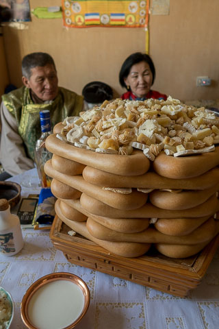 Much of the ceremony though seems to be known only by the oldest members of the family. In addition to the ul boov, the odd-number-of-layers stack of fried bread, on each table there is a stack of meat, mostly from a sheep, that is topped with the sheep's head, which may then be decorated with a pat of butter. Over and over we have heard of the importance of this stack of meat, and of the importance of its exact arrangement and stacking order. When we ask what that order is, or what it symbolizes, we are, with few exceptions, met with a stumped expression. Most of the people we asked, all relatively young, do not know the details, only that it is important and that it is traditional. Each has relied on the last members of the older generation within their family to take care of the details, and in both of these families, the oldest member has already been widowed. Beautiful as these traditions are, some of them are sitting on fragile ground.