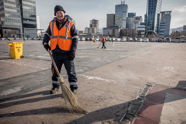 In a single generation Ulaanbaatar has quadrupled in population, and since 1980 the number of motor vehicles of all kinds in the entire country swelled from 32,200 to more than a quarter of a million. So while Mongolians have lots of experience with cold weather, their experience with roads and sidewalks is more recent. To those of us from the lake-effect region of the United States, where a meter of snow can fall overnight, the snow here is hardly noticeable until it falls on the polished granite slabs that have been chosen for use on sidewalks and stairs, making them as slippery as wet ice. When snowfall is significant the most common tool used to remove it is a broom. (I have never seen a snow plow in Mongolia.) When foot or car traffic compacts snow into ice, workers will resort to iron bars or a flat steel blade on a wooden handle, and then a shovel to remove the loose chunks. Once, in Sukhbaatar Square, I saw a worker with what I'd call a leaf blower, blowing light snow from the several acres of polished stone plaza along with a team of sweepers.