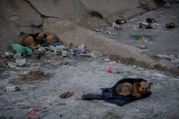 Hard as it is for people, I lack the imagination to understand how dogs survive here. These three have picked out the best garbage they could find to bed down on for a little nap.