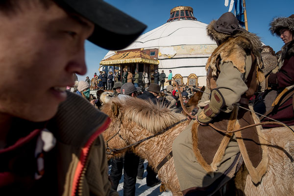 Viewers from all over the world have seen the same pictures that I have online, some of the best and most recent from Asher Svidensky as well as the documentary by Otto Bell, Eagle Huntress, whose subject is a young woman who breaks the gender barrier to learn this male tradition. (Aisholpan Nurgaiv, now 15, appeared at the festival with her eagle.) Photographers (from all over the world) were seeking a view to portray these hunters in an authentic way—one that didn't include the restaurant ger with the awning above its door, parked cars, children with pink plastic sleds, or foreign visitors with large cameras and tripods. More and more though, tourism and media have become an authentic part of these practices, and have shaped them for success in a context that is far removed from their origins.