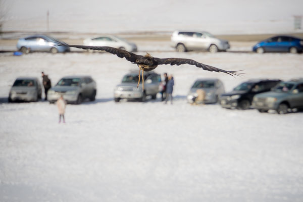 retrieve—the carcass of a fox or marmot is dragged down the hill behind the hunter and the bird is released from the top of the hill with the hope that it will tackle the dragged animal. While there were many successful entrants, there were also those that reminded us that these are wild animals, that they have minds of their own, and that no matter how good the relationship between bird and hunter, it is one that can't be taken for granted. Batjargal explained an announcer's warning, in Mongolian, to pay attention to small children and pets. Eagles have been known to find them attractive as prey.