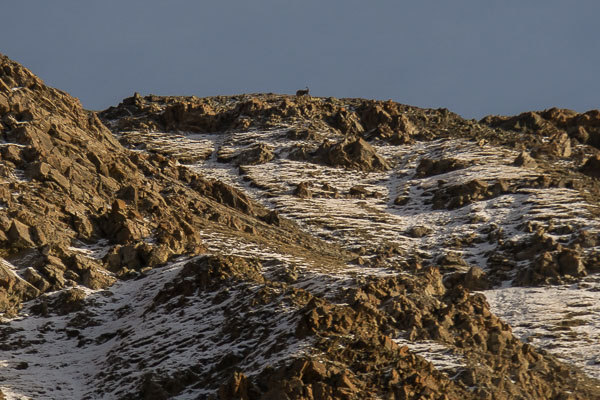 We left early, stayed late, and looked, especially Davaa, very hard. Although we saw prints in fresh snow, scat that was recently buried, the stripped hide from a recent kill, and the familiar odor of cat spray left to mark its territory, we joined the club of those who did not see a snow leopard. We did see argali sheep and ibex, and protected territory that, even in Mongolia, is free of litter. On this afternoon in late March we found our way down the mountain and back to the car by way of a frozen stream, descended the dry bed of a river at dusk, and wound our way around Jargalant's gravelly base, toward our home for the night, in the dark.
