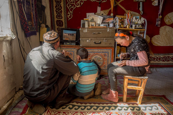 When tourists come so far to get to this part of Mongolia, there's an understandable desire to bring home pictures of a culture that is unique, or perhaps one that is still somehow untouched by time, but that is not the real story either. In the afternoon Argalai watches a horse race on his solar powered television, makes an appointment to have a tooth pulled with his mobile phone. He has skills that have taken generations to perfect but will take only one or two to lose in a world where the need for animal skins is replaced by the need for money. Tourism is the bargain he makes to keep one foot in each world, and it is not an easy bargain. The next afternoon as we are leaving for the Ulgii, an hour away, Agalai asked for a ride to go see his dentist. Although the film his daughter is featured in, and in which he participated behind the scenes, made its filmmaker nearly two million dollars, he does not own a vehicle to drive to town. He will spend the night with friends and take a taxi home the next day.