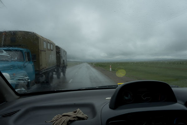 The difficulty begins with the fact that it is so hard to get to, that although red lines cross western Zavkhan on the official road map of Mongolia, when you cross western Zavkhan on the ground you do so on a road that ebbs and flows with the needs of the local nomadic population. In high-traffic areas you can choose between the least torturous washboarded tracks across the desert, experimenting with one before bailing out and trying another of the braided paths. In other places grass grows in the space between a single pair of sandy tire tracks—a few runs a year from supply trucks to a village