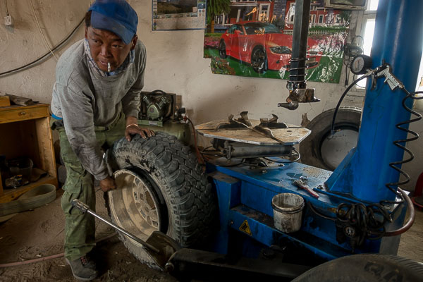 Not just a matter of the inner tube having a leak, huge gashes in the Russian tires must be patched to keep the tubes from bulging through the gaps.